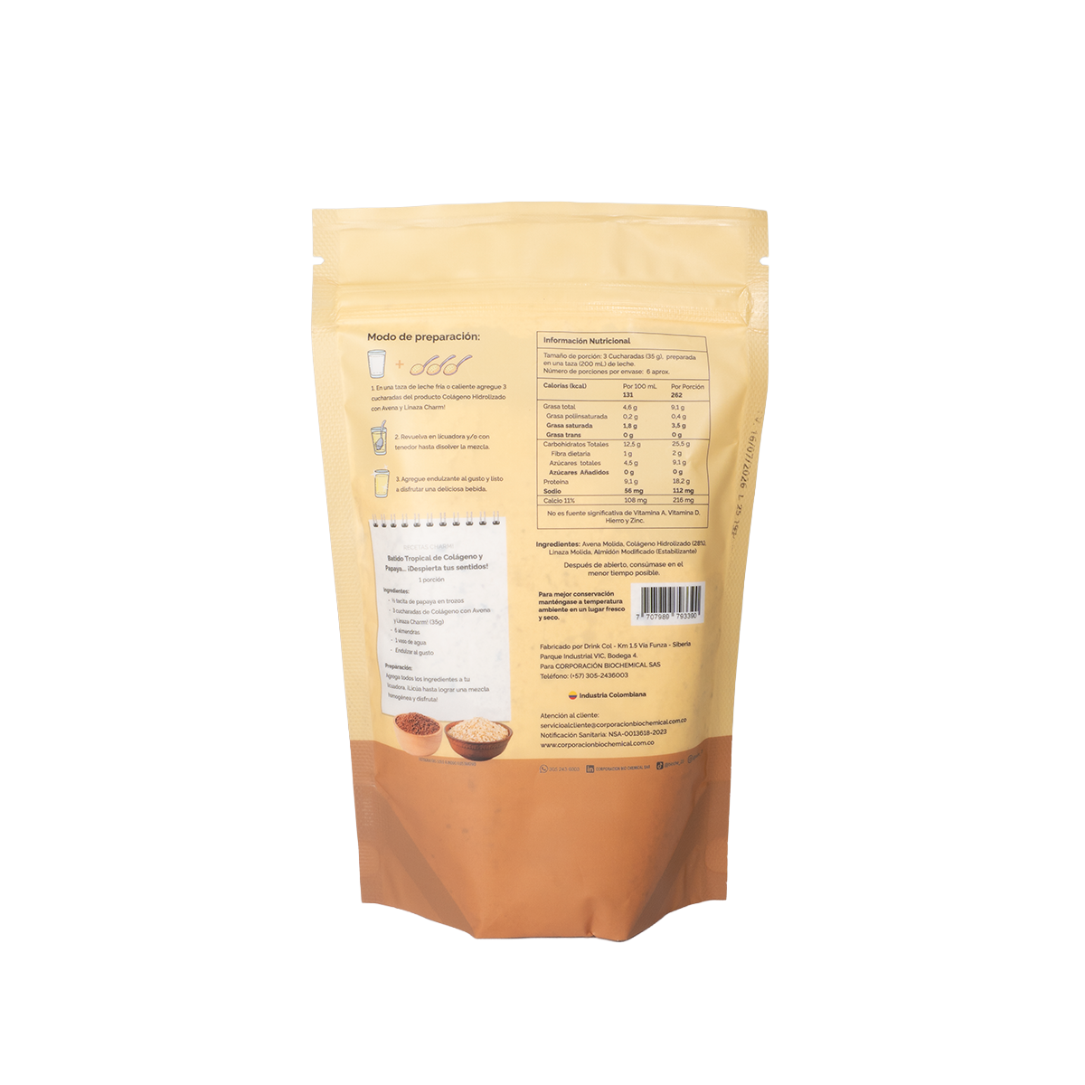 COMPOSICIÓN: Avena Molida, Colágeno Hidrolizado y Linaza.